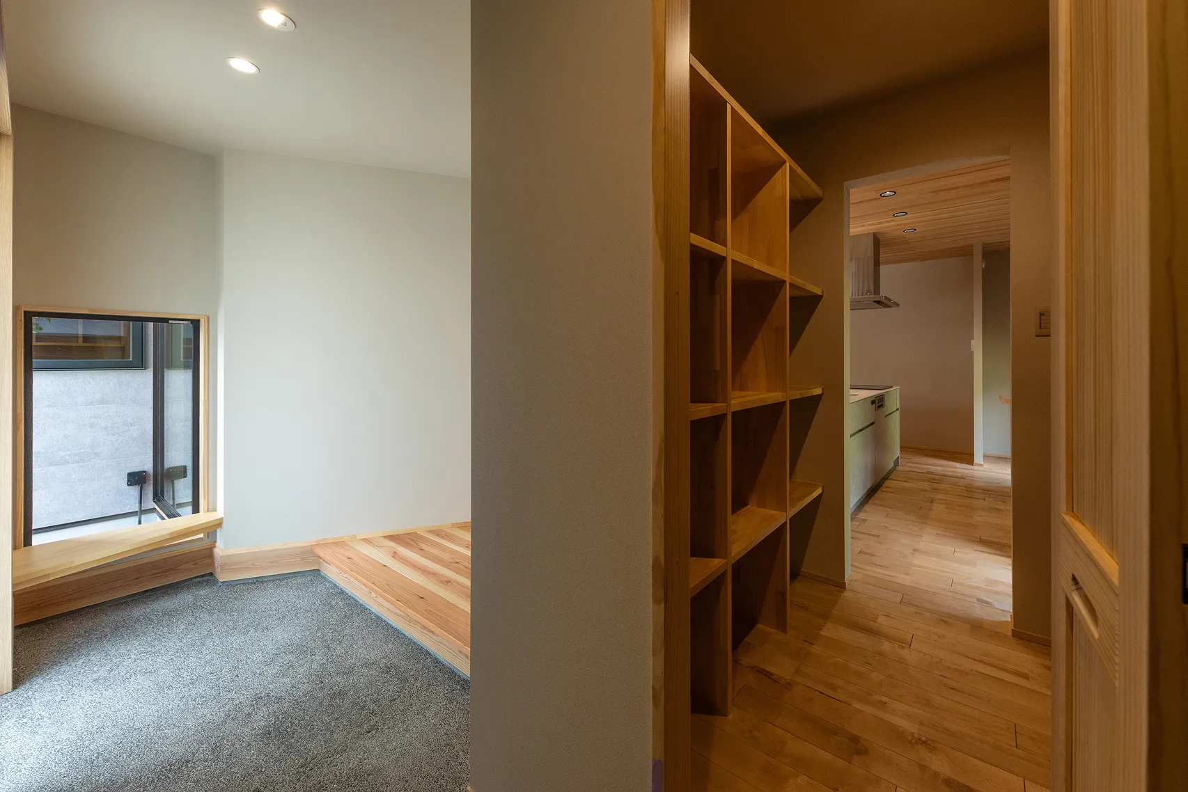 (奥様)実はパントリーに玄関、キッチン両方から行ける動線は、七福建設さんが私たちとの会話の中から「こういうのが好きそうだな」って汲み取ってご提案してくれたものです。どの会話から感じ取ってくれたのかは、私自身も覚えていないのですが、直感的に分かってくれたのかなと思いますね。
