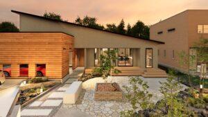 夜のライトアップしたお庭も美しいインナーガレージのあるお家が完成します。